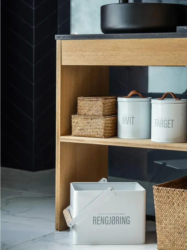 Samle krydder, oljer og kjøkkenredskaper i glass, kurver og på serveringsbrett. Det samme kan du gjøre på badet med apotekvarer, hårstrikker, bomullspads og andre småting. Gjør også vaskedagene til en lek med stilige bokser til rengjøringsmidler og vaskepulver, og legg papiravfall, tomflasker og annet avfall i papirposer som kan stå framme.