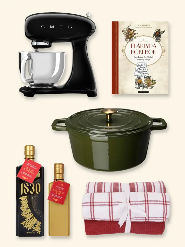 Sabor-støpejernsgryta fra Kremmerhuset gir den gode, hjemmelagde smaken som fyller hele huset med duft, mens Smeg-kjøkkenmaskinen fra Kitchen tar seg av de tunge jobbene så du kan fokusere på det som er hyggeligst. Et sett med kjøkkenhåndklær fra Kid gjør det hele litt mer praktisk, og litt mer “julete”.