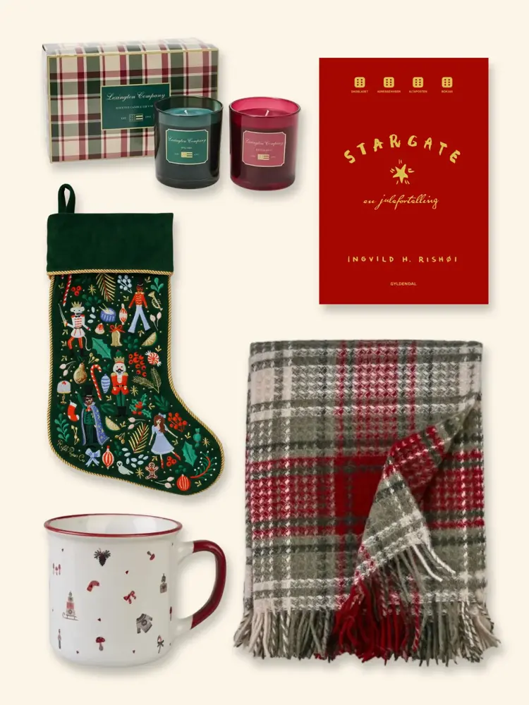 Et mykt ullpledd som Waffle Check fra Kid gjør det ekstra fristende å bli sittende litt lenger. Holiday-kruset i rødt setter stemningen, enten du fyller det med kakao, gløgg eller bare en god kopp te. På peishylla eller bordet gir Lexintons duftlys-sett en lun juleduft som gjør rommet varmt.
