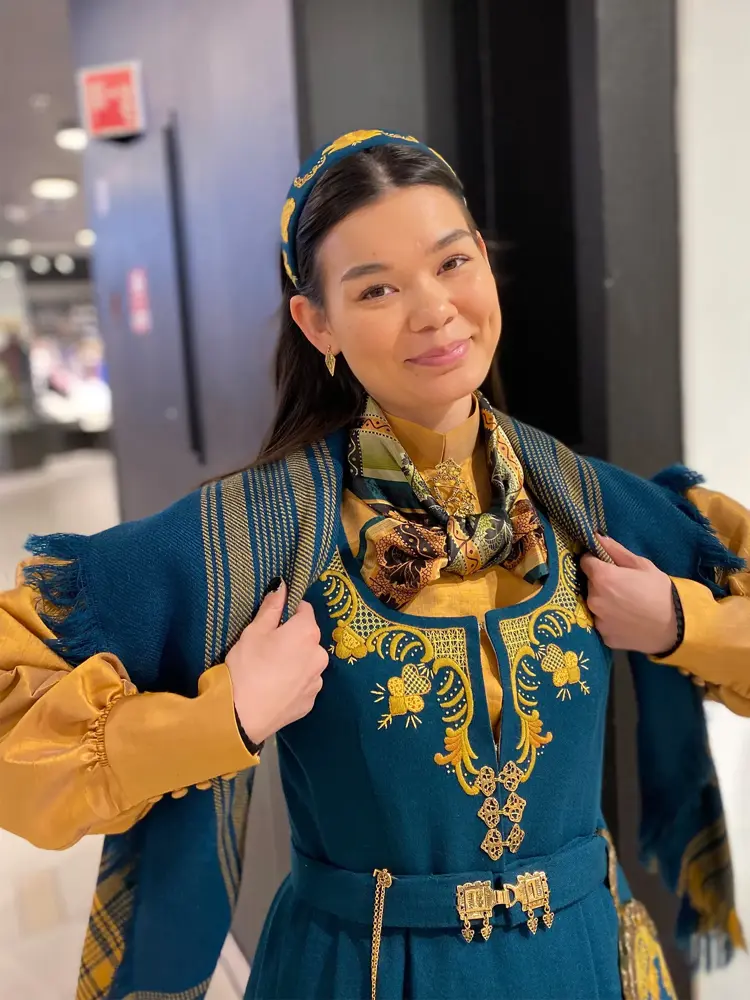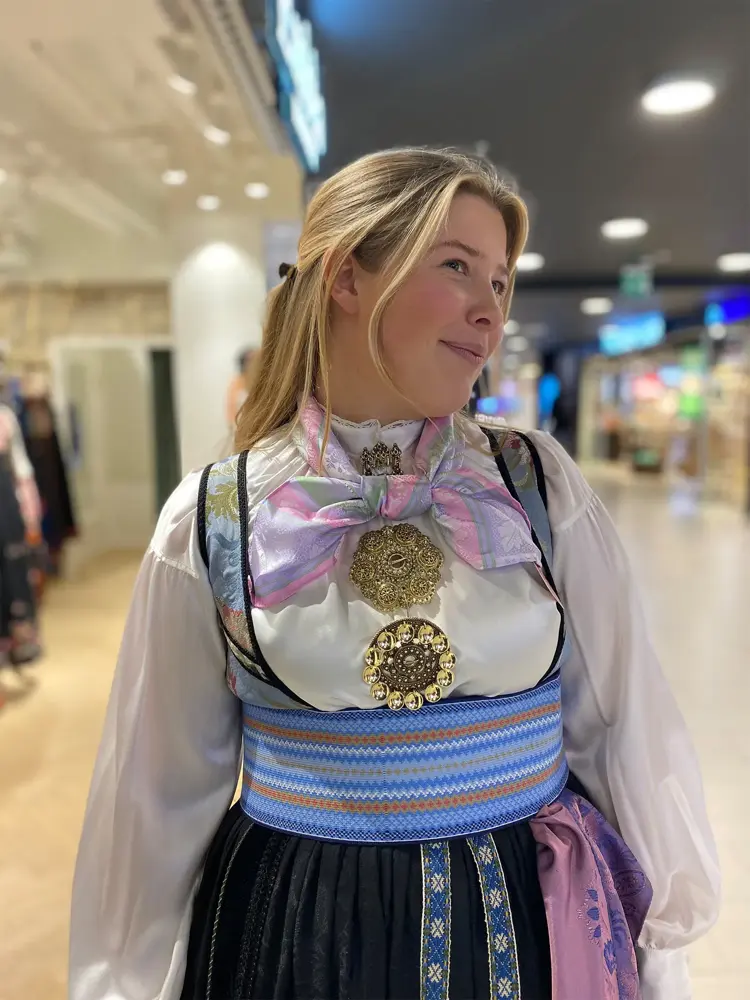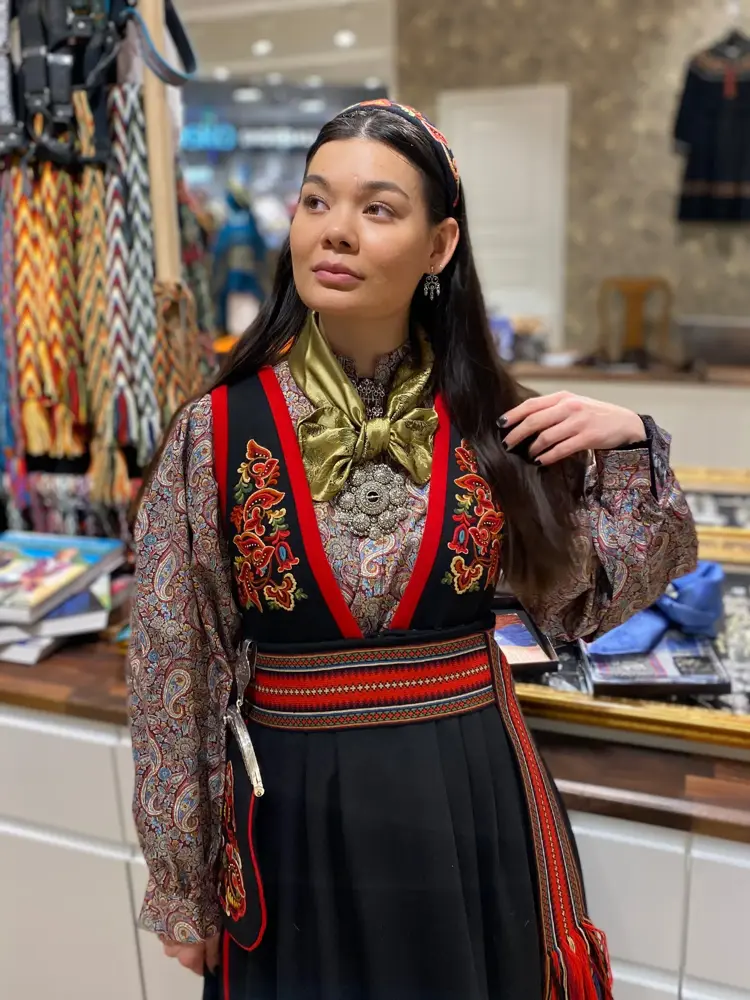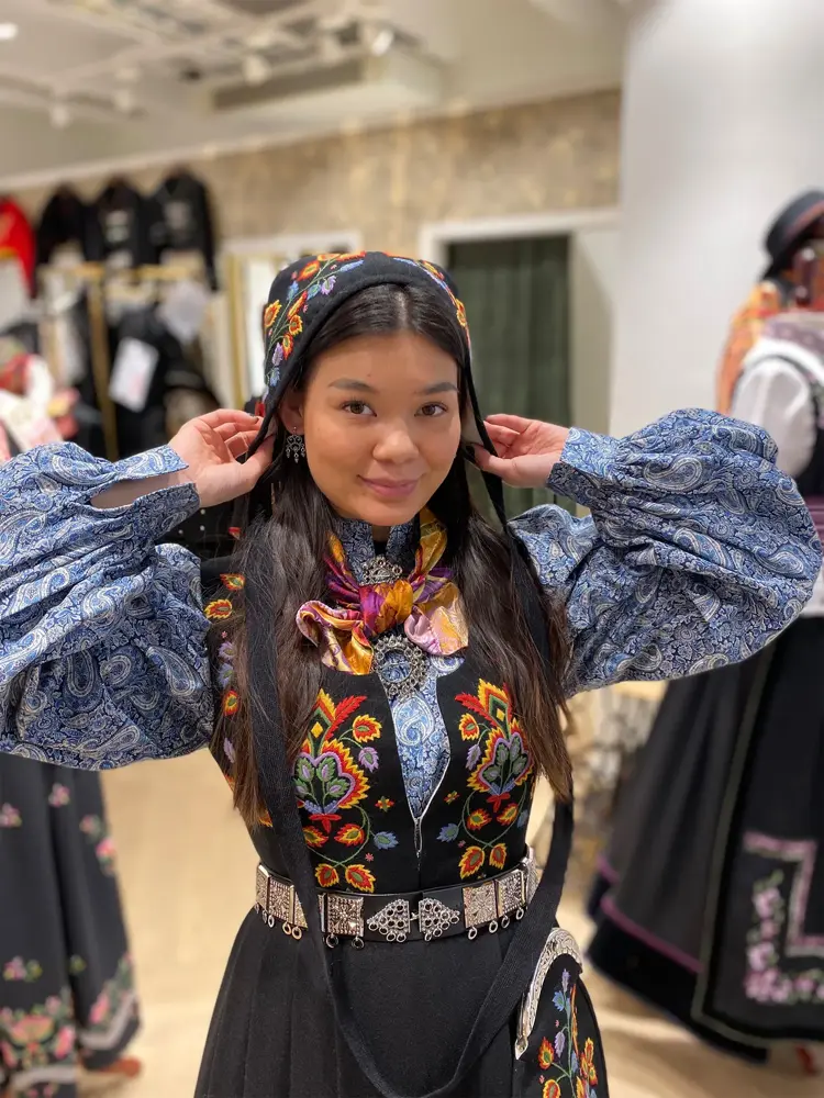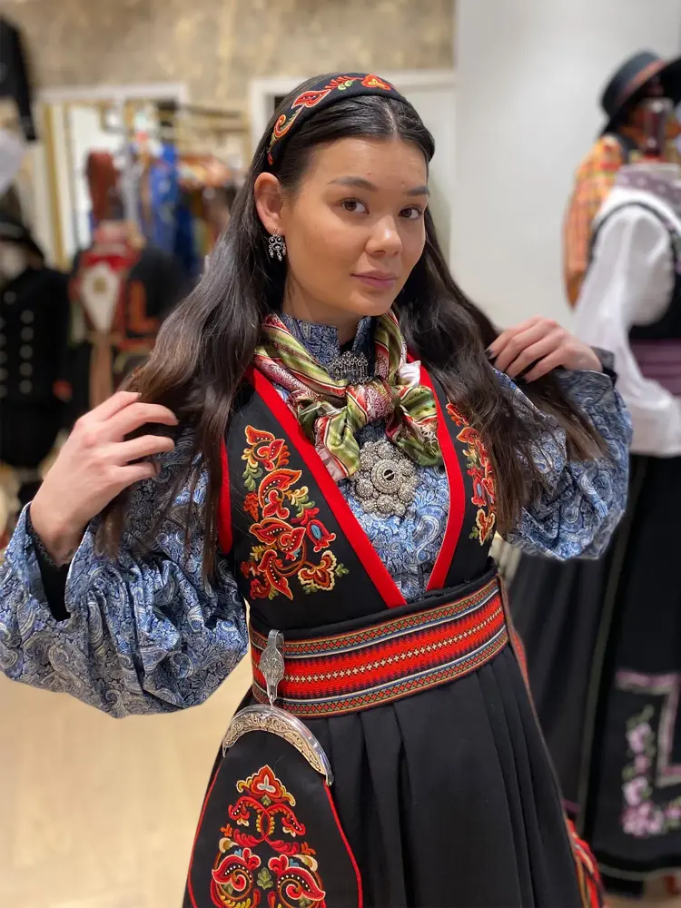 Hos Embla elsker de å style bunader! De er spesielt glade i å piffe opp bunaden med silkeskjorte og silkeskjerf i forskjellige farger og mønstre.