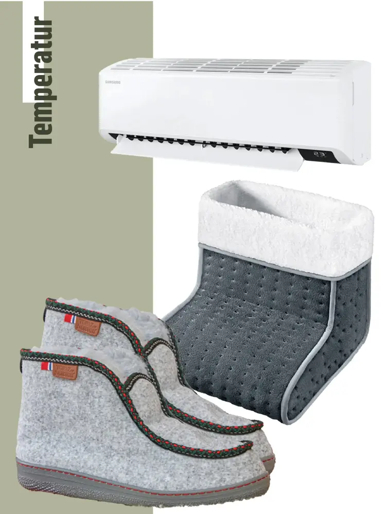 Forsøk å holde temperaturen mellom 19-21 grader i hjemmet. I stedet for å skru opp varmen over dette, kan man for eksempel kle på seg en genser og varme tøfler. Enklere liv har tøfler med varmepels fra Topaz som holder hele foten varm gjennom kalde dager. Ønsker du å pakke inn føttene ekstra godt kan du også bruke en fotvarmer. Bruk fotvarmeren slik den er, eller plugg inn ledningen og sett på ønsket varme, forvarmeren bruker ikke mer enn 15 watt.