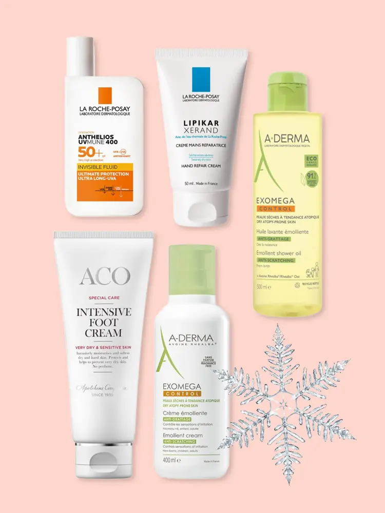 Hendene er ofte utsatt for kulde og kan bli ekstra tørre når det er kaldt ute. Til dette anbefaler Boots La Roche-Posay Lipikar håndkrem, som reparer og beskytter såre hender. Til føttene kan du bruke ACO Special Care Intensive Foot Cream, som pleier og forebygger tørr og hard hud.