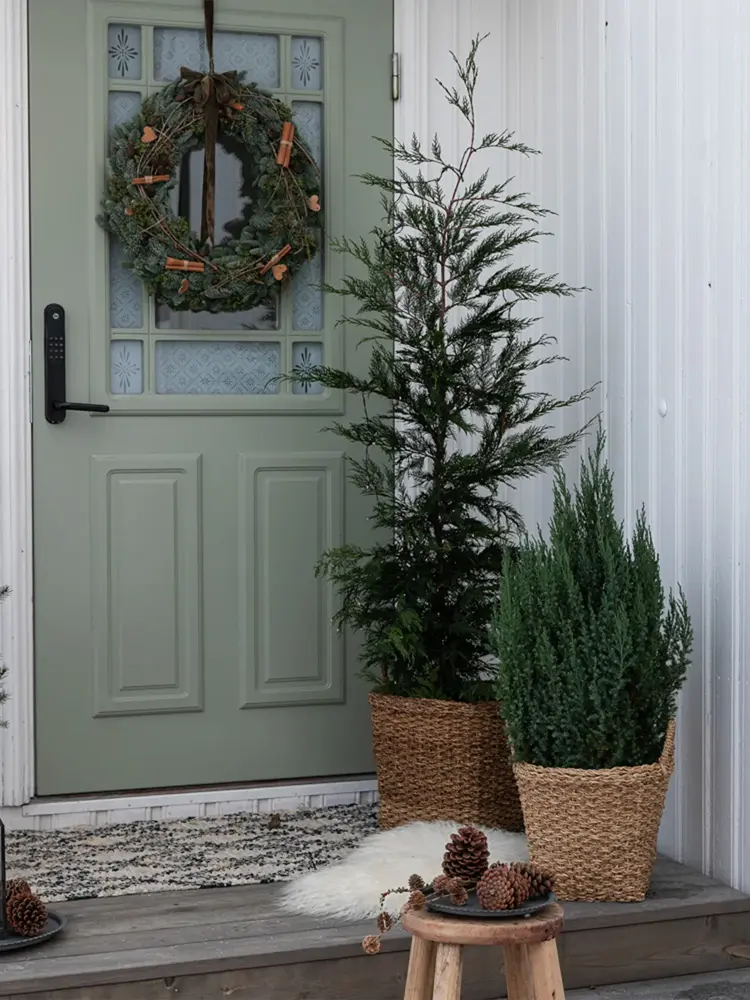Start julestemningen allerede ved inngangspartiet med vintergrønne nåletrær i potte, en hyggelig krans på døren, dekorative lyslenker og lykter, tipser Plantasjen.