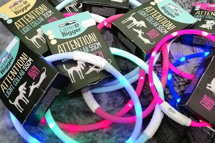 - Sørg for at hunden alltid er godt synlig når dere er ute! Et lysende halsbånd gjør at man ser hunden på avstand, og er uunnværlig i vintermørket. Det er mye tryggere for hunden.