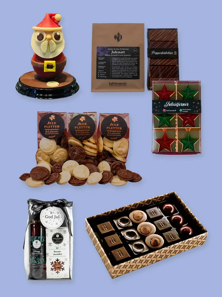 Gi pappa en søt opplevelse med håndlagde sjokolader fra Sebastien Bruno eller Kaffebrenneriet. Unike smaker som salt karamell og hasselnøttnougat, eller pepperkakebarer trukket i fyldig sjokolade. Du får også dekorative sjokoloadeskulpturer hos Sebastien Bruno, formet som nisser og snømenn.