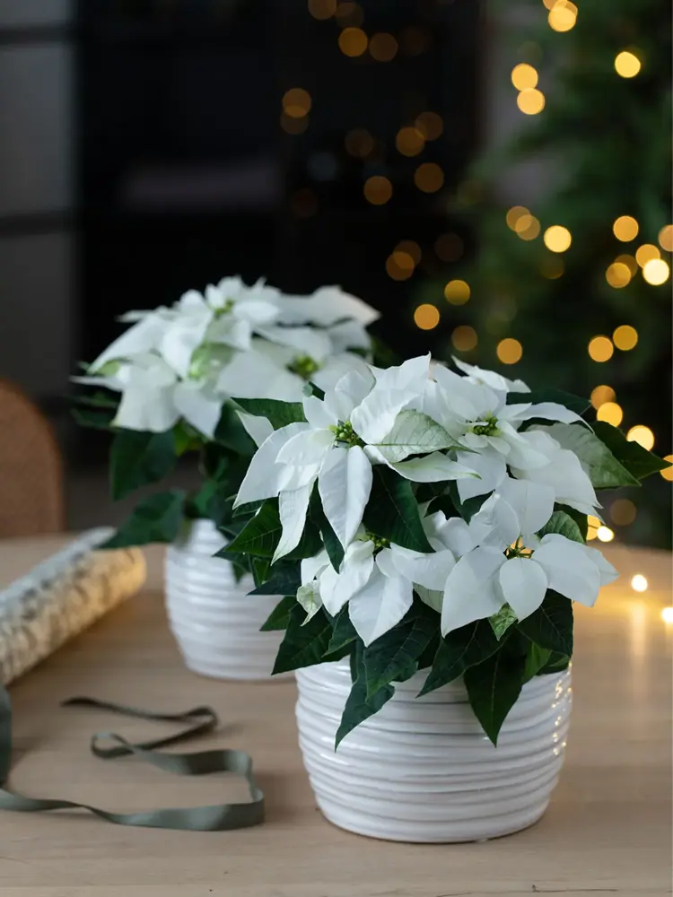 Juleroser: Disse vakre hvite blomstene tåler snø og kulde ute! Men de er også vakre i en potte inne. Plasser dem svalt, og hold dem jevnt fuktige.