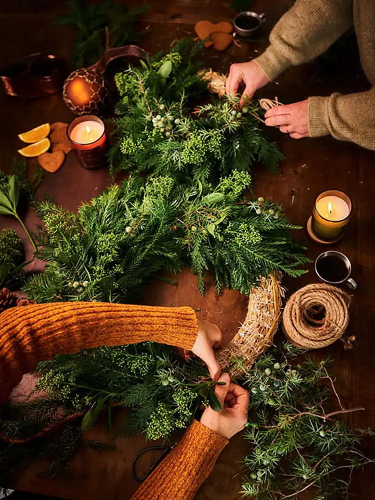 Eller lag din egen krans ved å blinde fast granbar på en bastring med tvunnet ståltråd. Så er det bare å supplere med kongler, svibler, julekuler eller lys – bruk fantasien, og slipp løs kreativiteten.