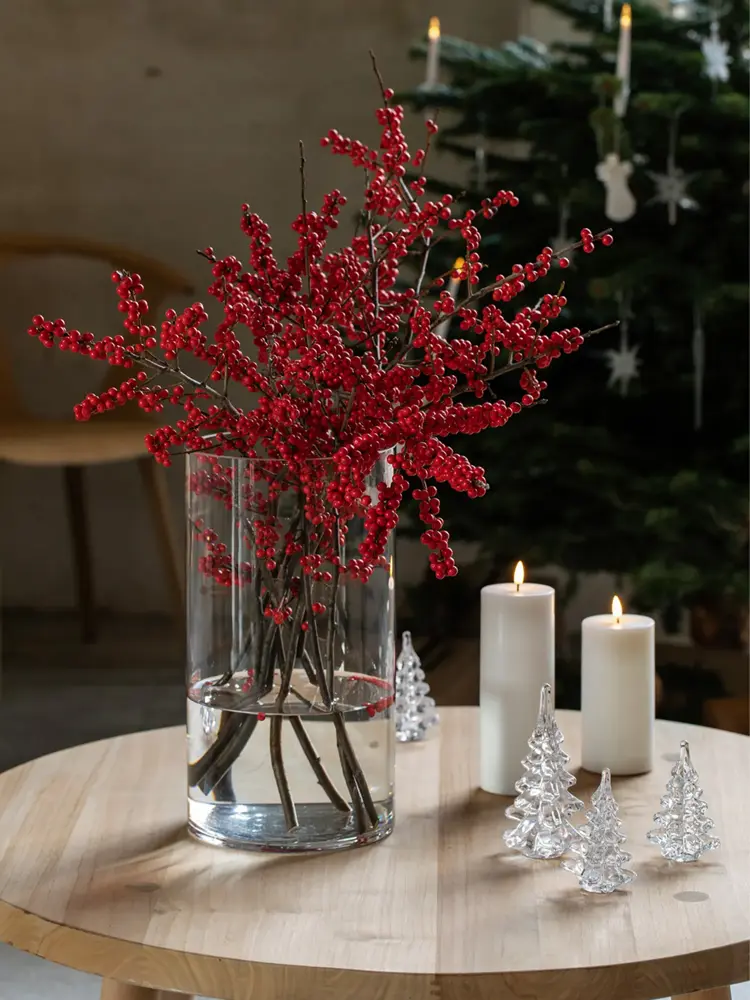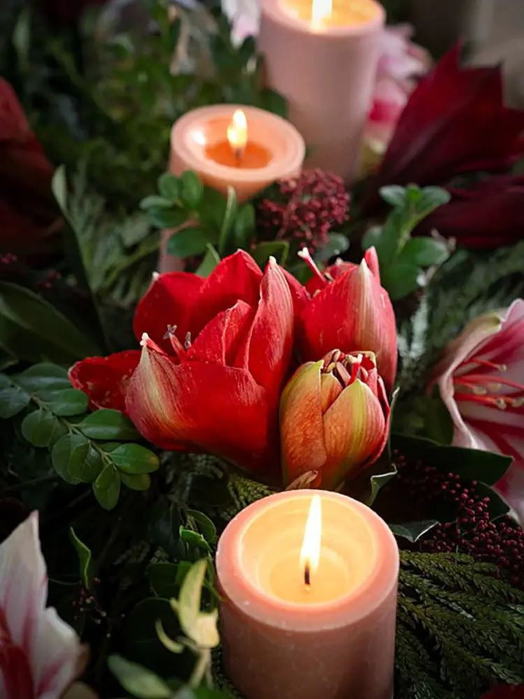 - Pynt gjerne med julekuler, juletrær eller annen julepynt mellom blomstene og lysene.