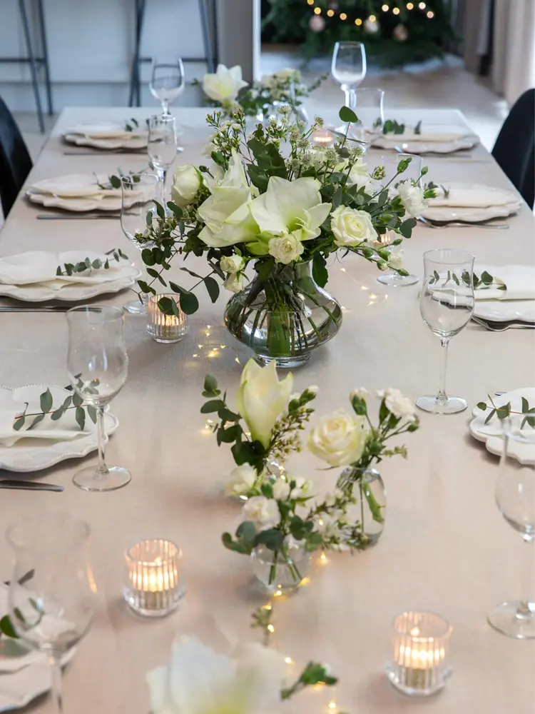 Blomster og julepynt skaper en lun og hyggelig stemning ved bordet, så vær raus med blomster og lys. Det er lekkert å holde seg til en fargeskala. Rødt eller hvitt er favoritter til jul, mens hvitt og fersken passer ekstra fint til nyttår.