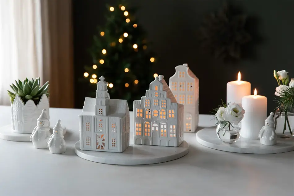 Levende lys kommer man heller ikke utenom når man skal gjøre det koselig. Med et lysfat kan du samle lys og pynt så det gir et ryddig uttrykk, og det er enkelt å flytte rundt på. Bruk kubbelys og pynt fatet med små vaser med blomster, telysestaker, bar, kongler og annen julepynt. En liten landsby med lyshus er også veldig stemningsfullt.
