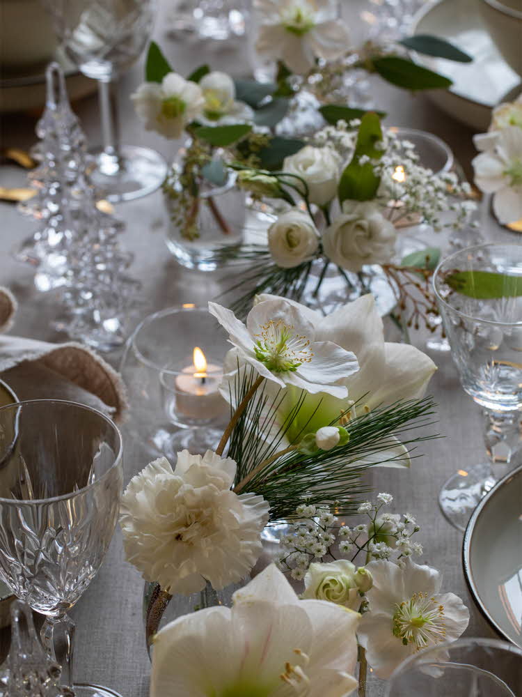 Du kan også bruke små vaser eller glass og fylle de med avskårne blomster og grener av sesongens grønt. Mellom vasene er det fint å pynte med levende lys og lyslenker, og legge litt ekstra pynt på hver kuvert.