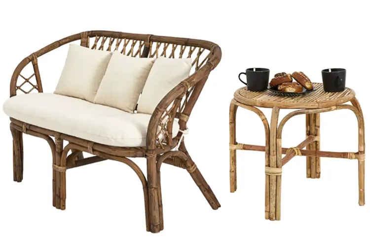 Clas Ohlson: Rottingsofa med puter, 1498,- // Sidebord i rotting, 499,-