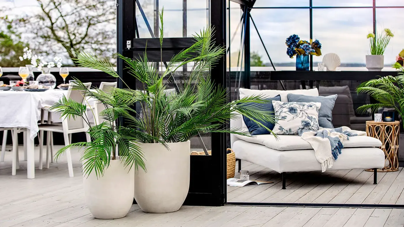- Utepotter tilpasset størrelsen på uteplassen, og eviggrønne palmer eller stråplanter gjør susen. I tillegg kan man innrede med puter, en vase og lykter for stemningsfulle kvelder, forteller han videre.