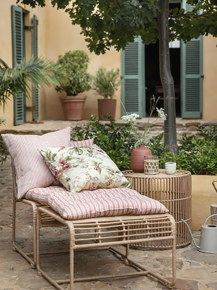 Innred uteplassen med en rustikk og landlig følelse, med rotting som går til alle farger og nyanser.