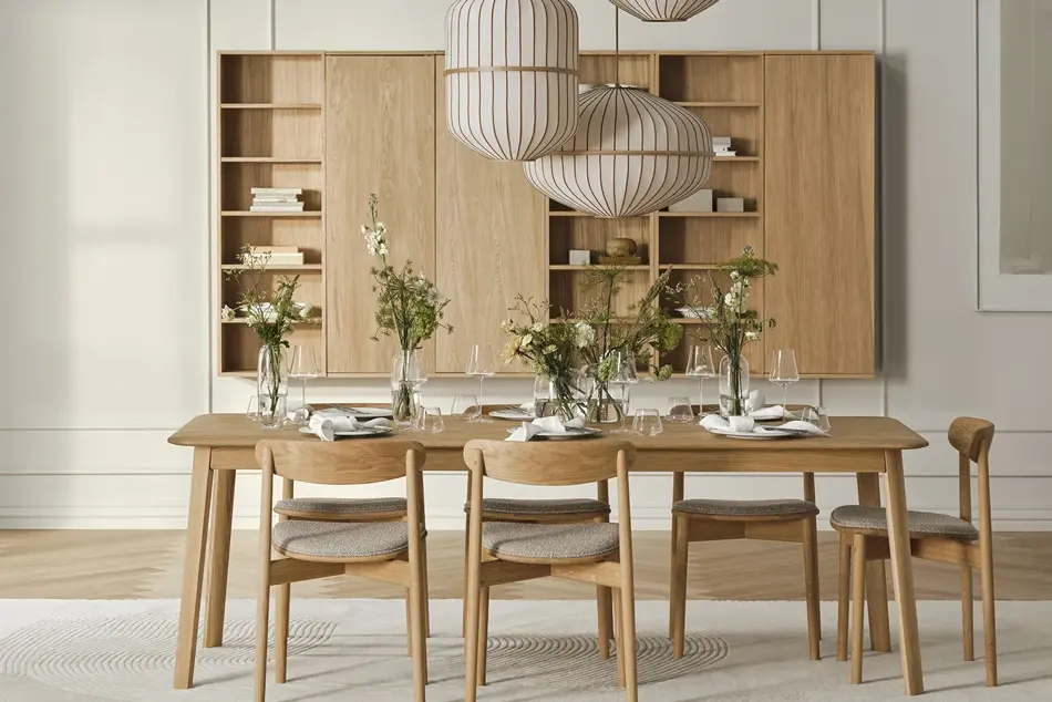 Blant vårens nyheter finner vi Palo spisebord, laget av FSC-sertifisert eik med raffinert design. Lucén-lampen bringer Japandi-estetikk inn i hjemmet, med sitt minimalistiske, men likevel varme uttrykk. Orb-lysekronen tilfører rommet en elegant touch med sine røkfargede glasskuler og en sofistikert messingring.