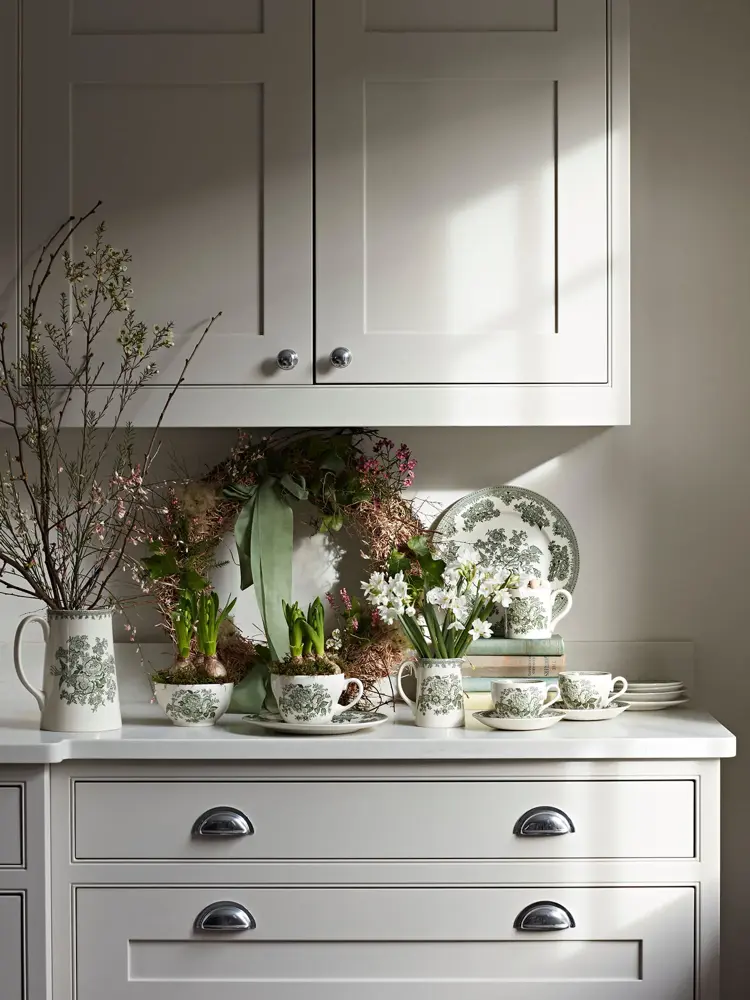 Naturlige toner og tidløs eleganse. Hos Kid Interiør dominerer to stilretninger denne våren: Green Story og Blue Story. Green Story er en frisk og harmonisk palett med sandtoner, dempede grønntoner og solfylte gule innslag. Broderier, scallop-detaljer og sitronmønstre gir et lekent preg og skaper en levende atmosfære. Blue Story byr på beroligende blåtoner kombinert med varme sand- og beige nyanser, noe som gir et klassisk og tidløst uttrykk. Store vaser og asymmetriske detaljer setter prikken over i-en i denne stilen.